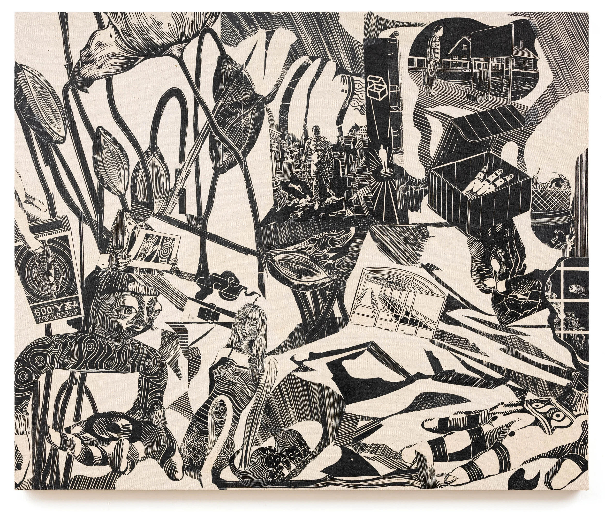 If you look closely at Li’s larger prints, including one of the pieces in Marginal Notes, you’ll see that they are collages of many prints cut out and pasted together to compose one complete image. “I always draw each part of the print as an individual flash,” says Li. “Most other artists draw in a different way: they draw the whole landscape, the whole composition, at once.” Li’s approach results in packed, busy artworks, filled with detail, making the minimalism of his pieces at Ben Brown unusual.